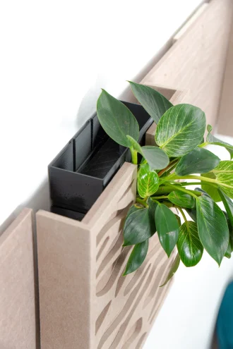 Jardinière en polypropylène recyclé fabriquée à Saint-Étienne. Façade acoustique en feutre 60–80 % PET issu de bouteilles plastiques recyclées. Assemblage en ESAT à Lyon. Design 100 % français.