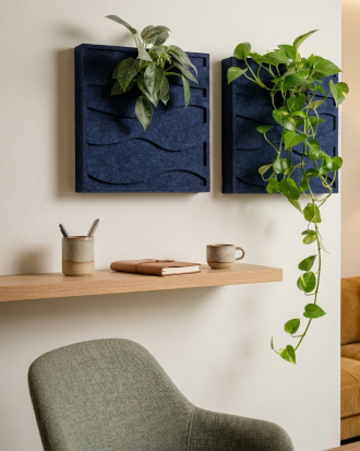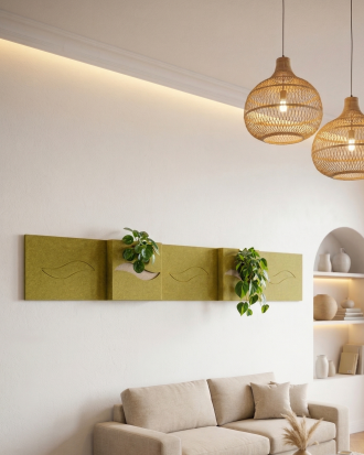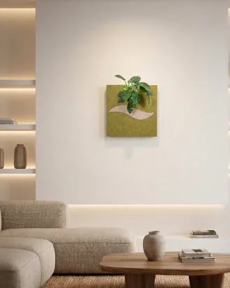 Tableau végétal acoustique collection Wind — lignes ondulantes inspirées du mouvement du vent. Revêtement en feutre acoustique recyclé issu de bouteilles plastiques. Feutre haute densité (NRC 0,8) pour une bonne absorption du bruit. Jardinière murale intégrée avec une vraie plante. Arrosage facile, toutes les 2–3 semaines. Tableau seul ou assemblage en mur végétal, à vous de composer votre oeuvre.