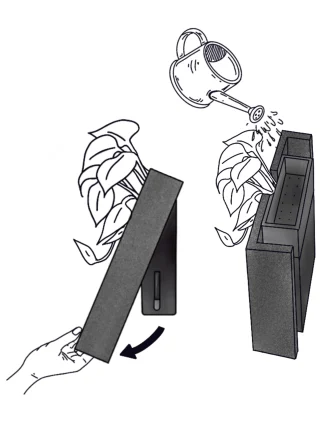 Chaque tableau est équipé d’un réservoir d’eau intégré visible sur la tranche. Il suffit de le remplir toutes les 2 à 3 semaines — l’eau monte par capillarité jusqu’aux racines des plantes. Aucune pompe, aucune batterie, aucun entretien quotidien.
